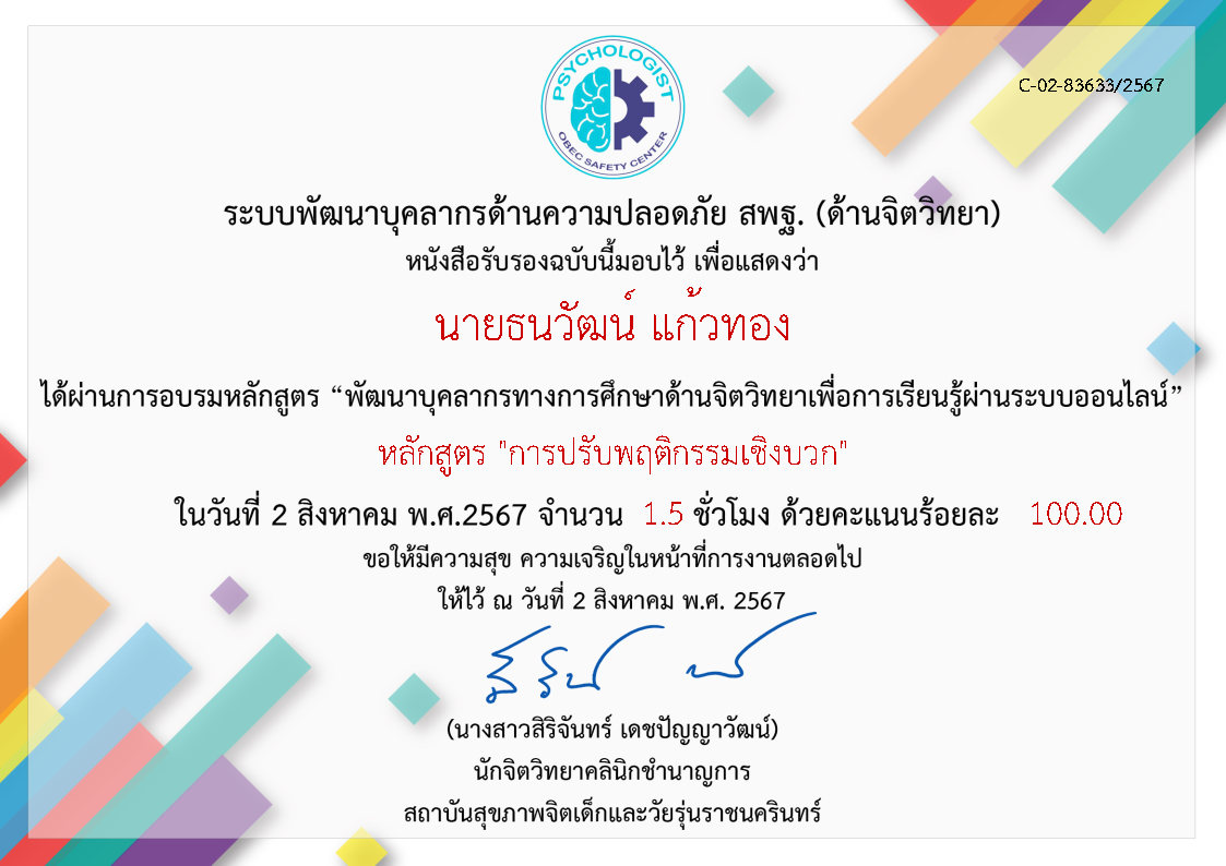 ผ่านการอบรมหลักสูตรอบรมมารตรฐานความรู้วิชาชีพครู หน่วยการเรียนรู้ที่ 1 การเปลี่ยนแปลงบริบทของโลก สังคม และแนวคิดของปรัชญาเศรษฐกิจพอเพียง รุ่น 003 |